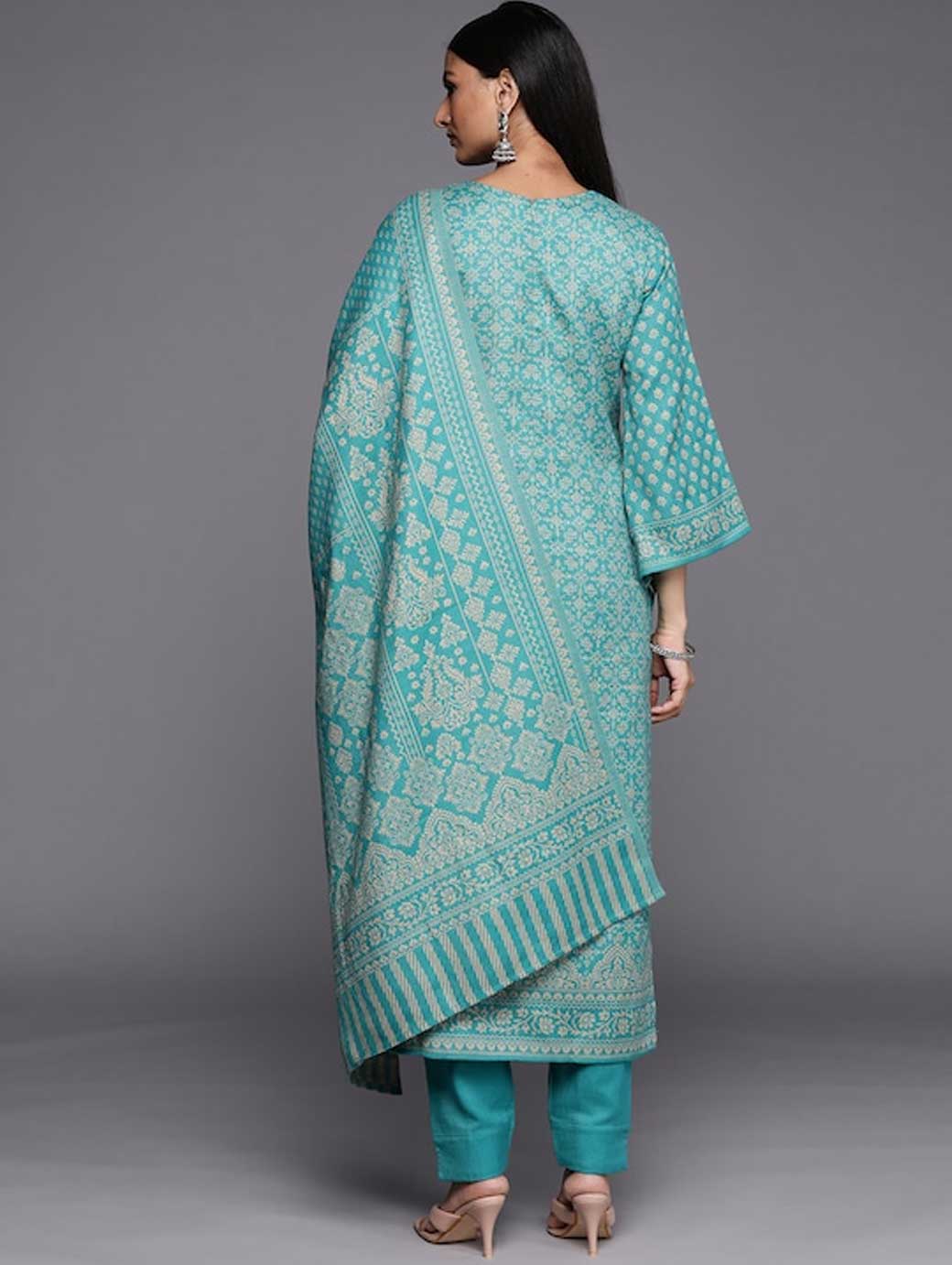 Green and beige woven design unstitched dress material