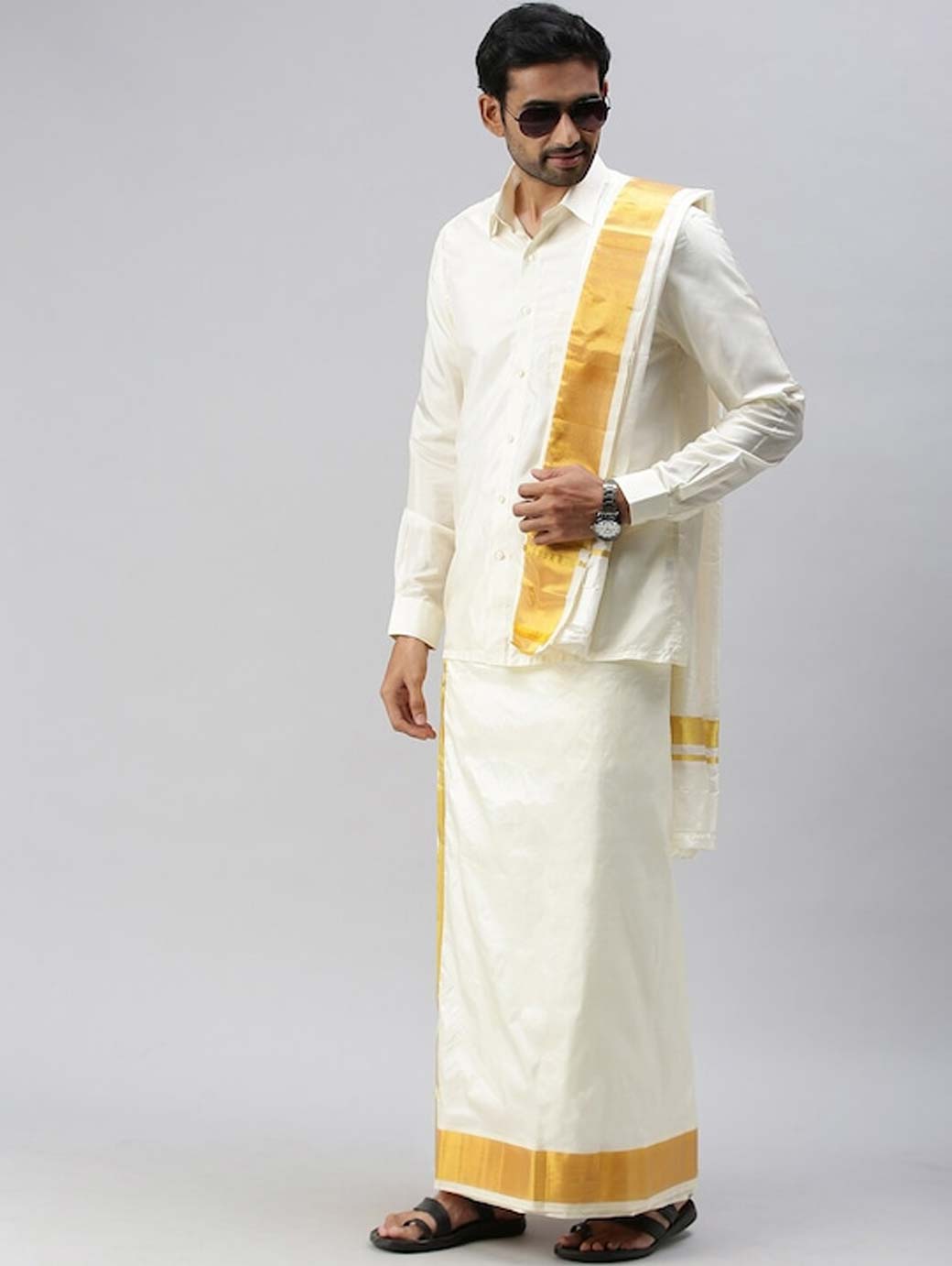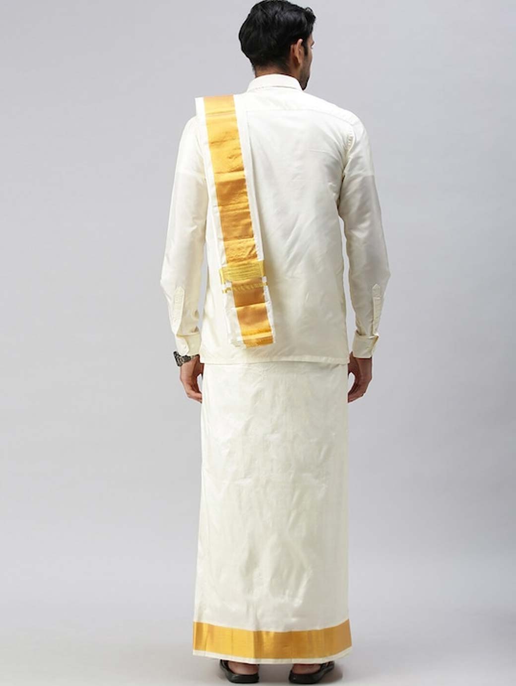 Cream-coloured solid dhoti, has a gold-coloured zari border Cream-coloured solid towel, has a gold-coloured zari detail border