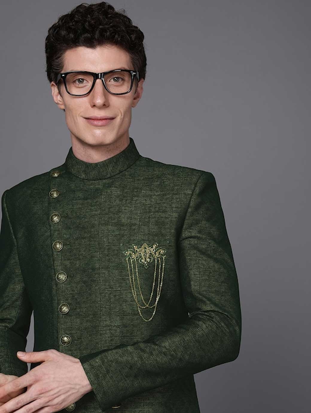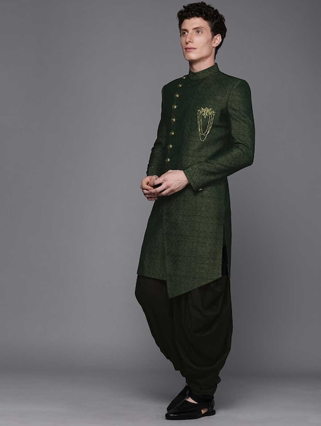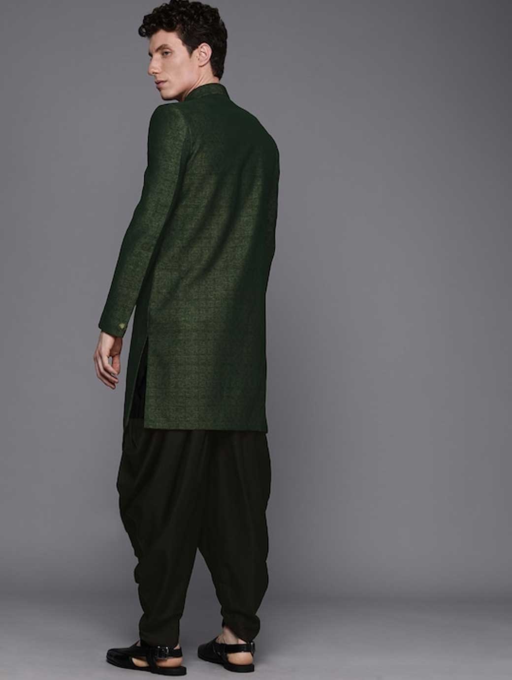 Men Green & Black Solid Sherwani Set