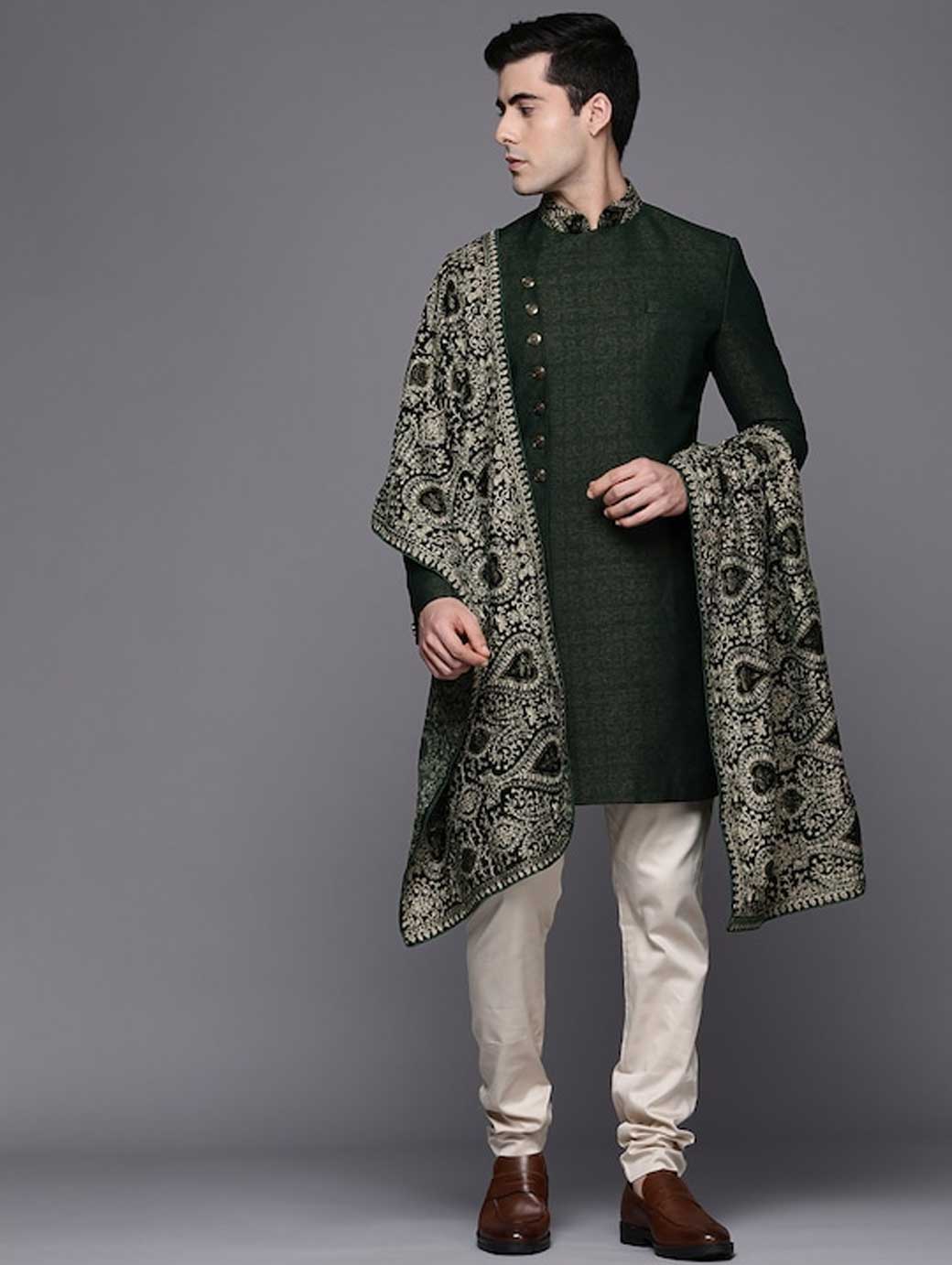 Men Green & Off White Self Design Sherwani Set With Dupatta