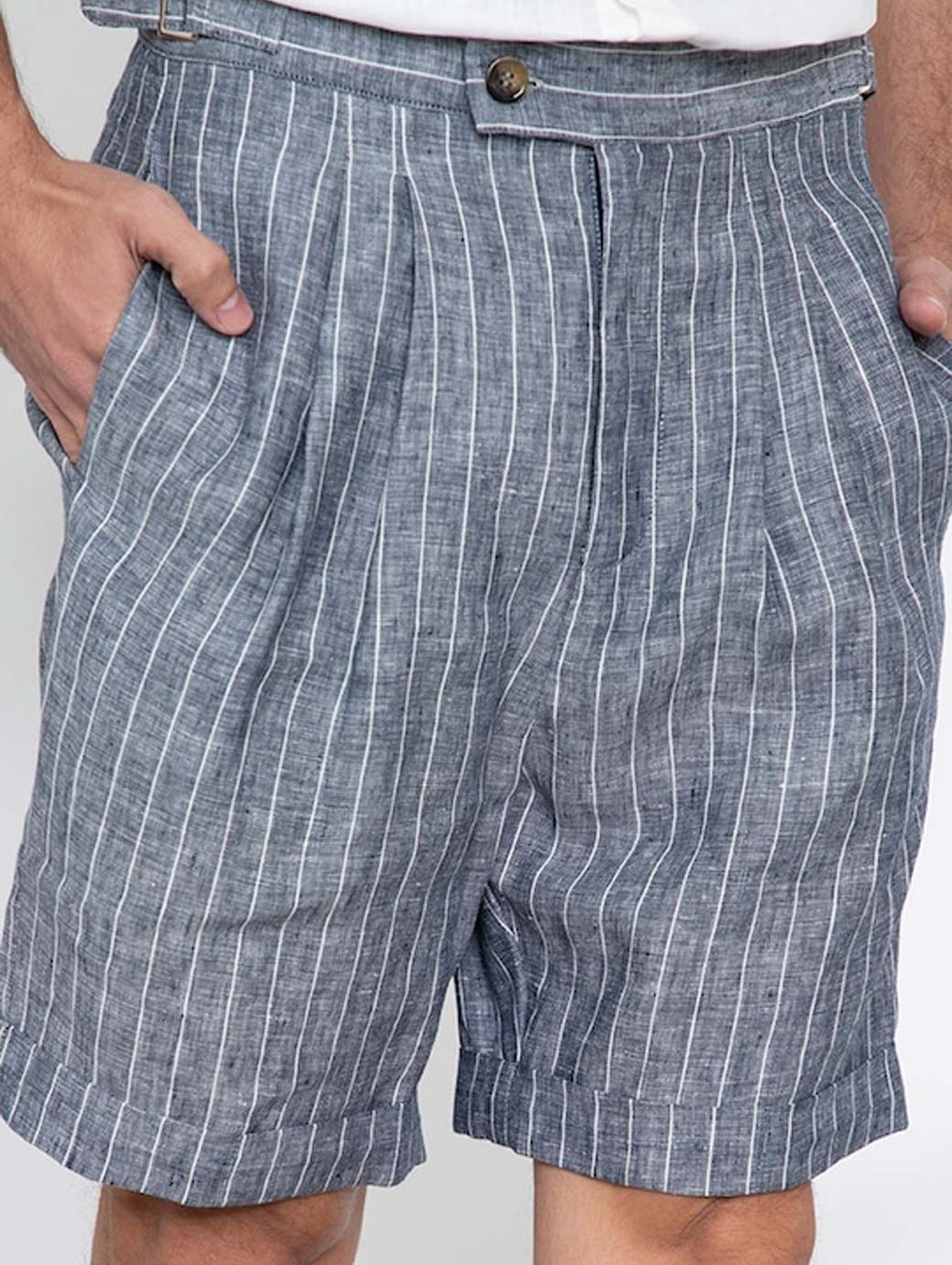 Grey striped mid-rise slim fit shorts has button closure and 4 pockets