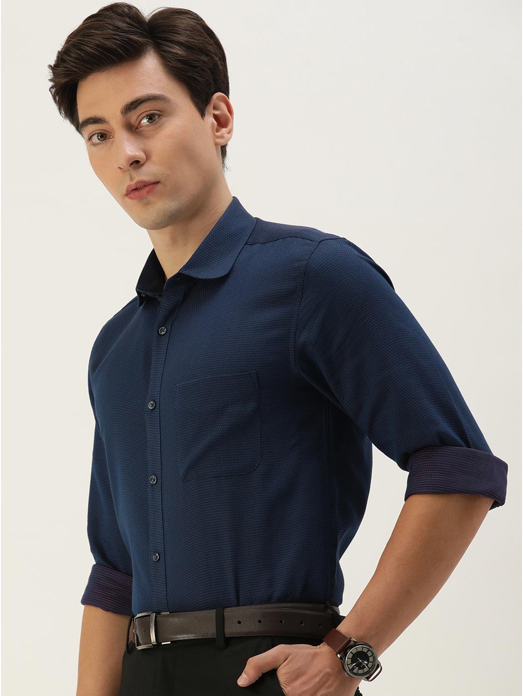 Navy blue textured self design opaque Formal shirt ,has a spread collar, button placket, 1 patch pocket, long regular sleeves, curved hem