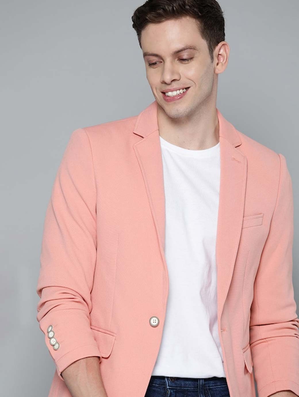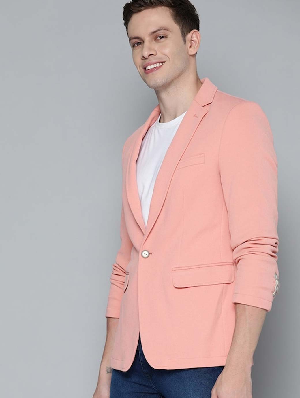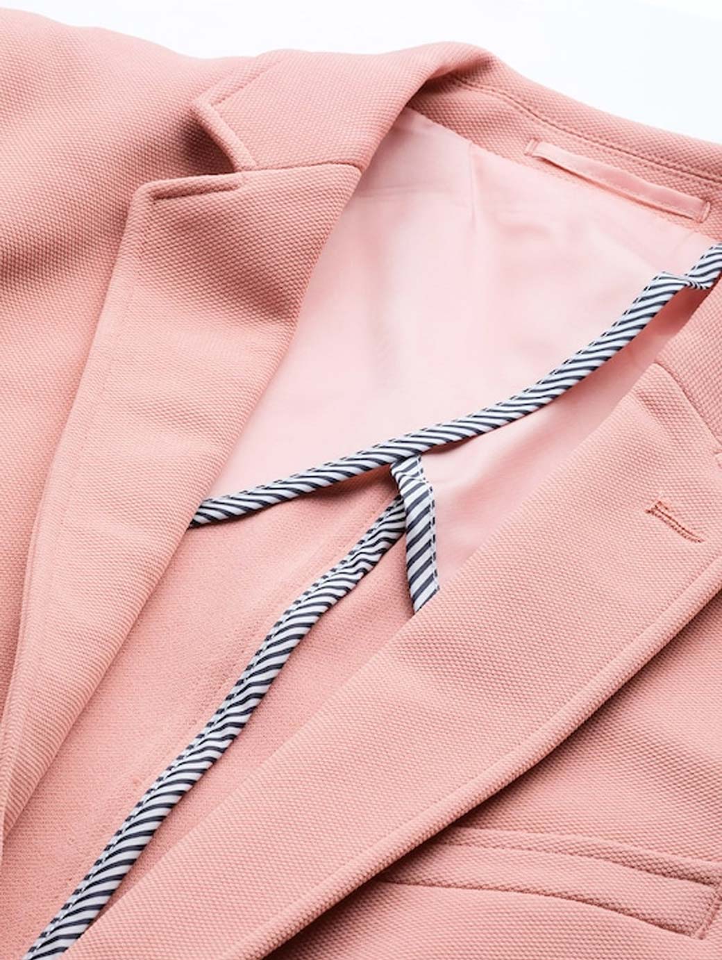 Pink textured casual blazer, has a notched lapel collar, single-breasted with a button closure, long sleeves, 3 pockets, an attached lining with 3 built-in pockets, straight hem with double vented back