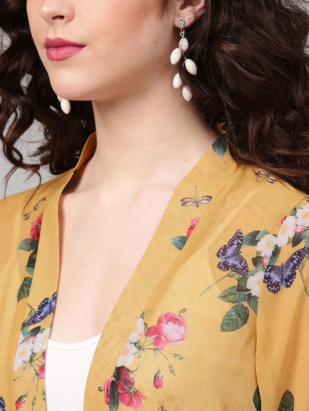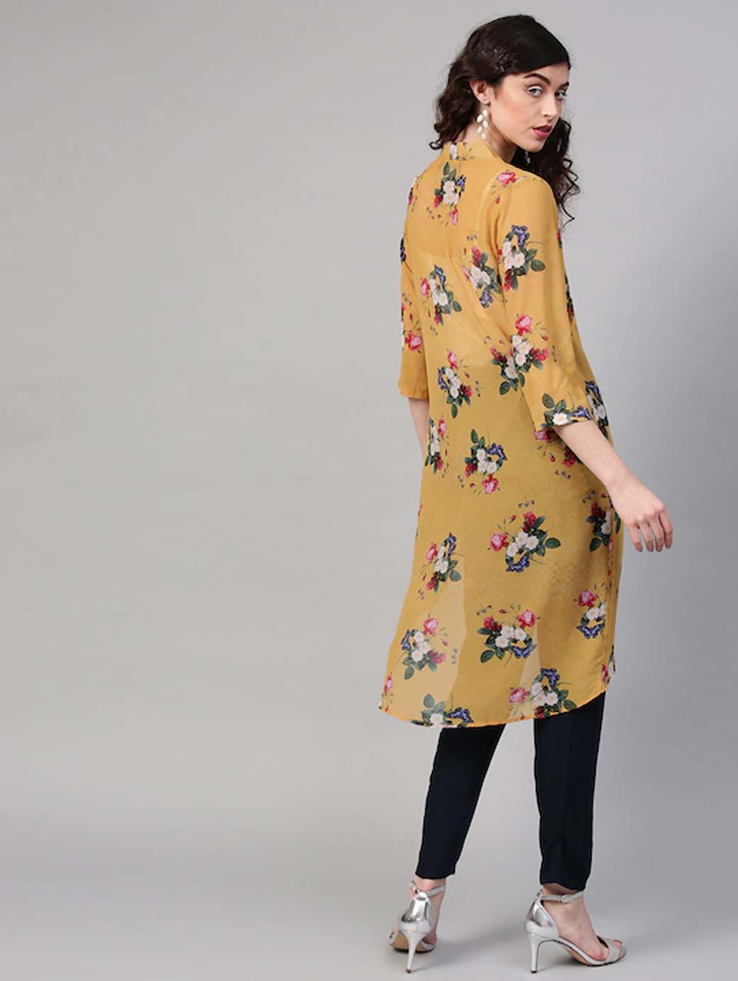 Mustard yellow floral print open front longline shrug, has three-quarter sleeves, straight hem