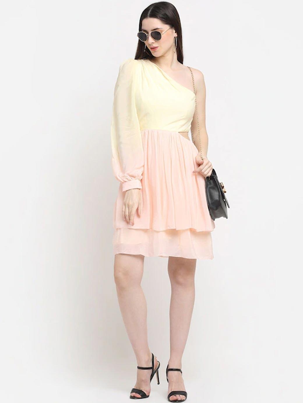 Pink and yellow solid fit & flare dress, One shoulder, Long, puff sleeve, Gathered or pleated detail, Above knee length in flared hem, Crepe fabric, Concealed zip closure.