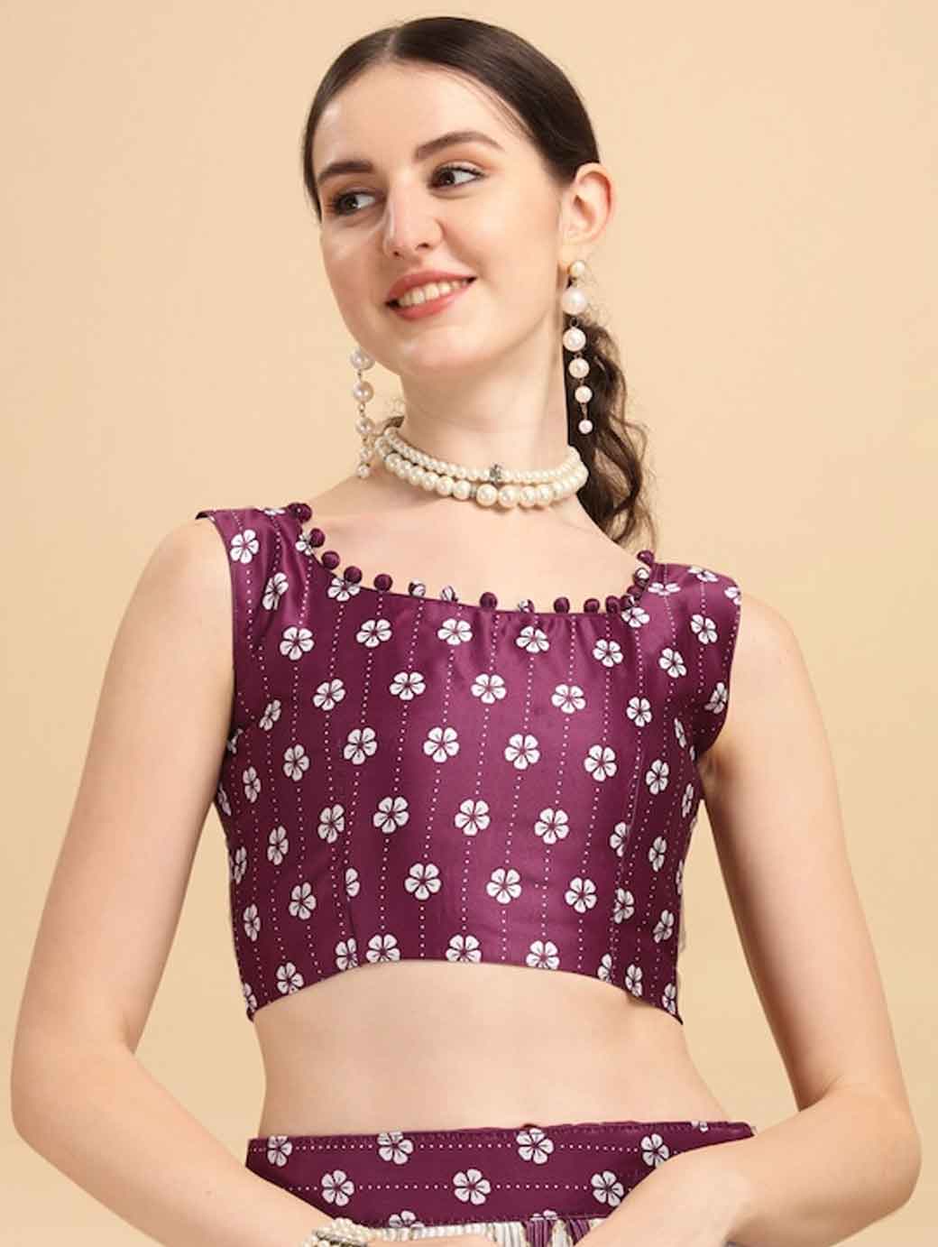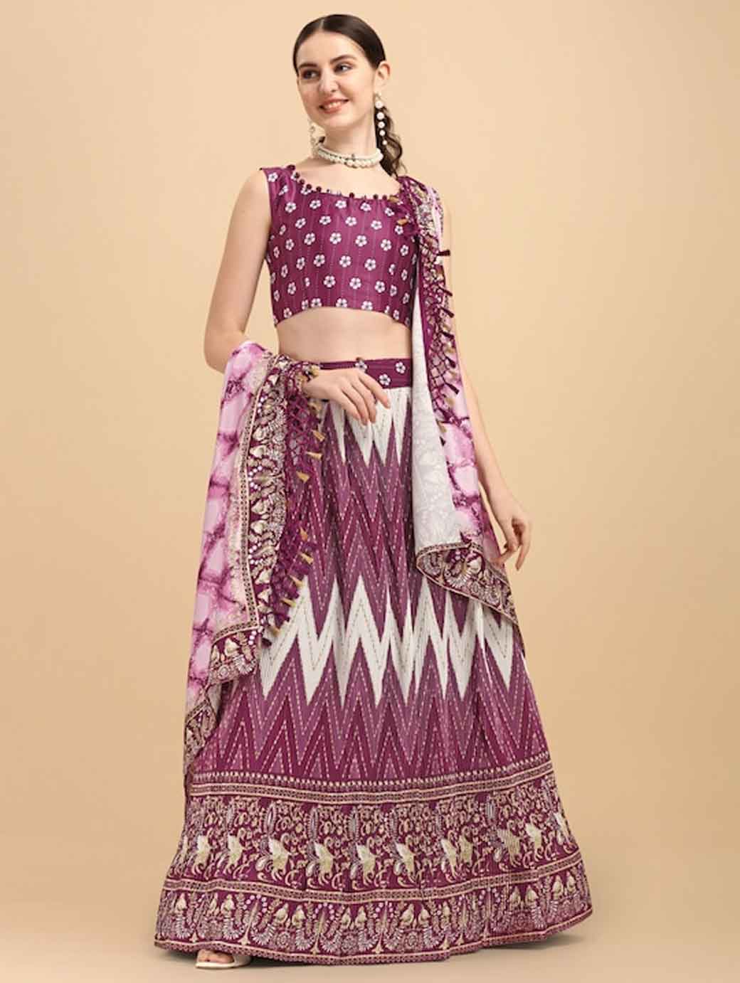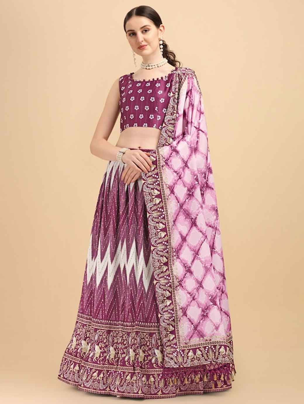 Purple and white printed lehenga choli with dupatta,
