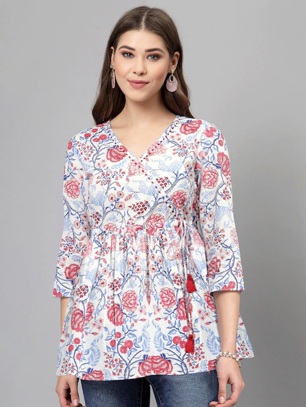 White and red longline wrap top Floral print V-neck, three-quarter, regular sleeves Gathered or pleated detail Woven cotton Tie-ups closure.
