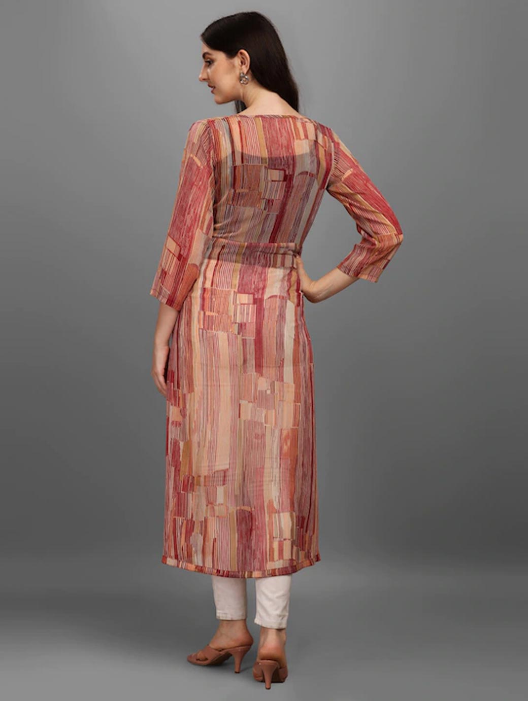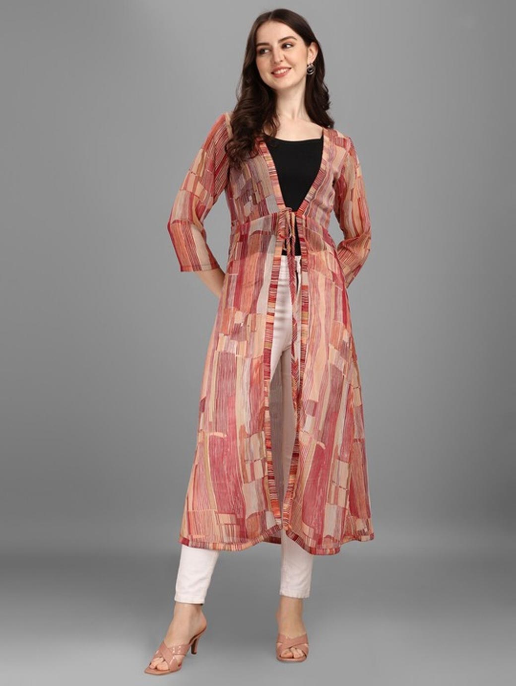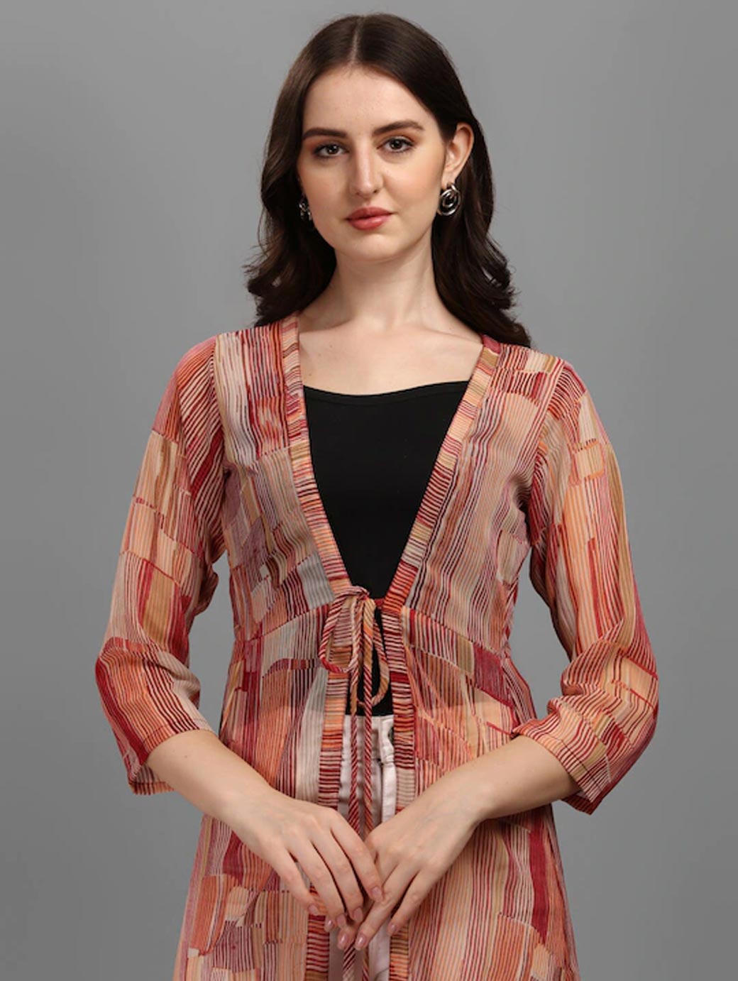 Brown printed tie-up longline shrug ,has three-quarter sleeves, straight hem