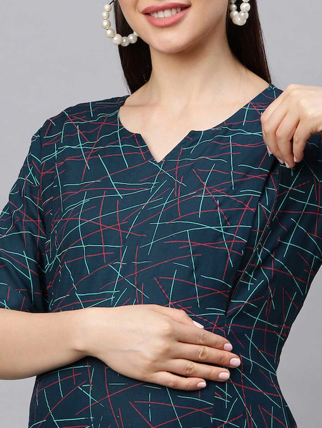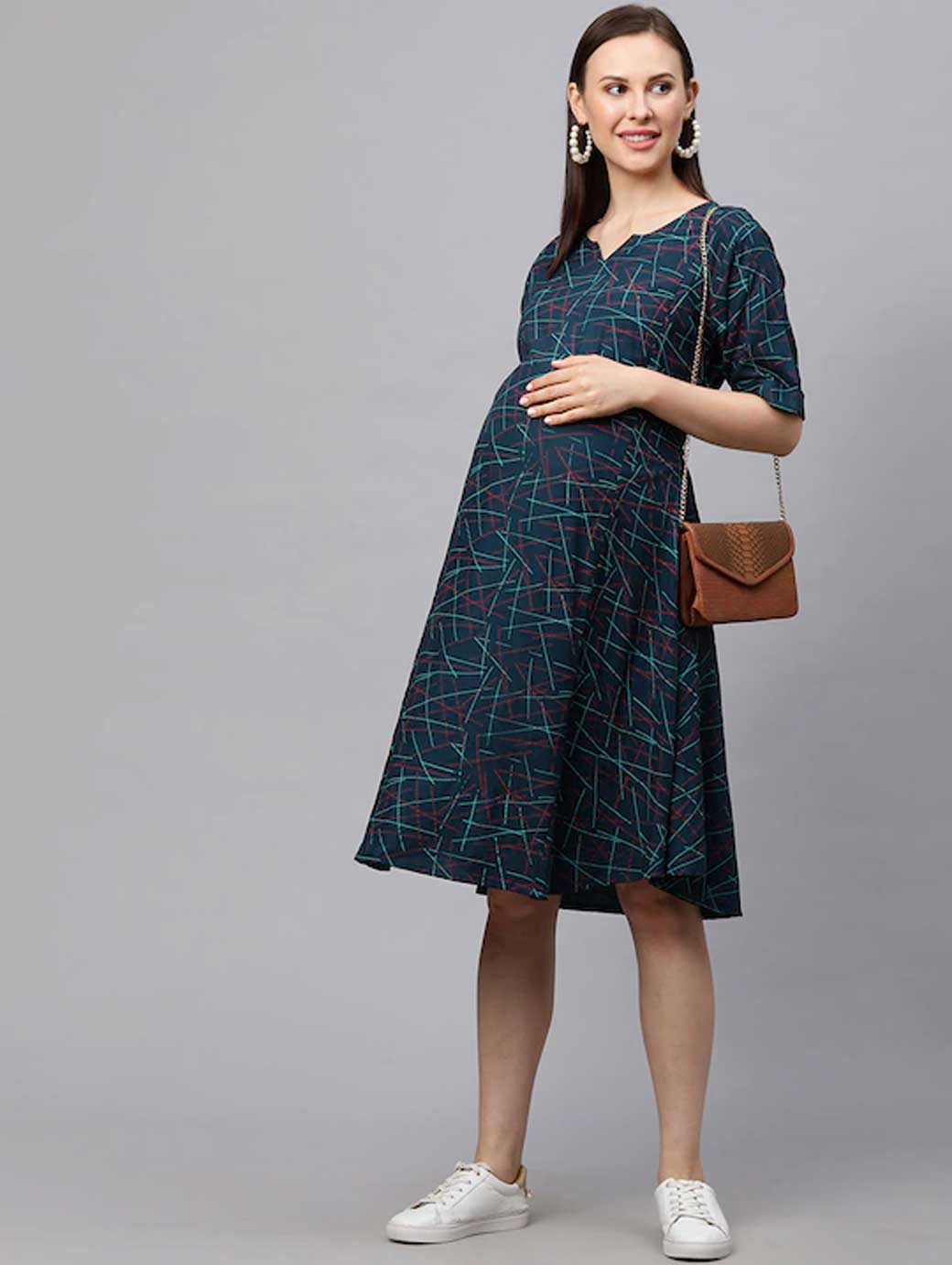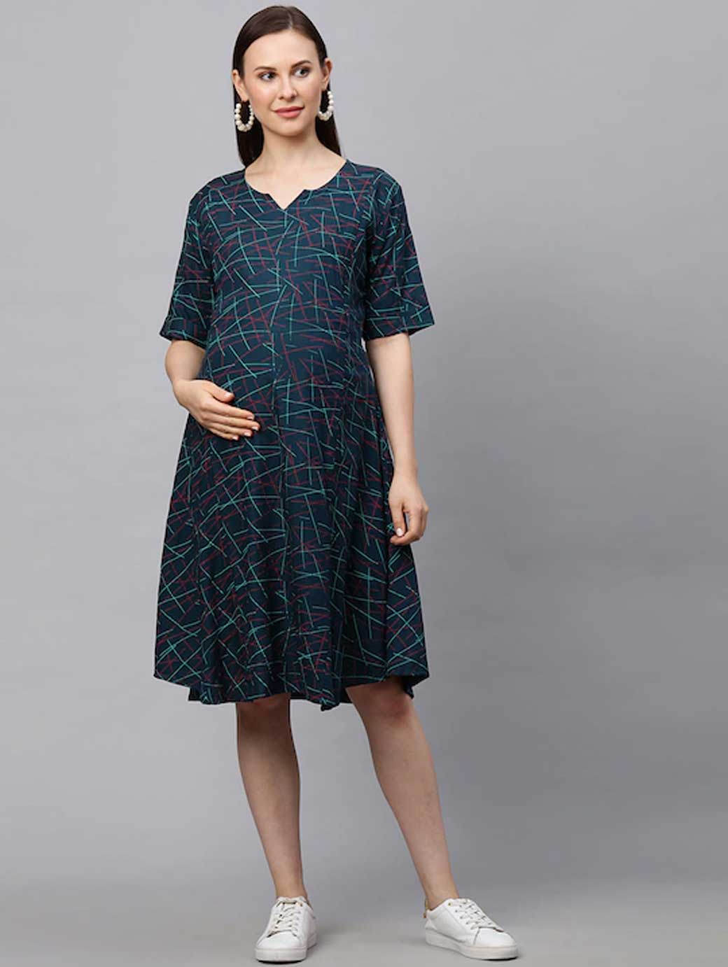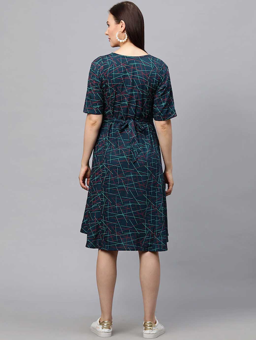 Green printed woven A-line dress, has a round neck, short sleeves, and flared hem