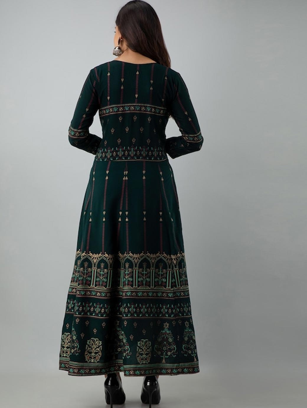Ethnic motifs printed Tie-up neck Long, regular sleeves Anarkali shape with regular style Thread work detail Ankle length with flared hem Machine weave regular viscose rayon