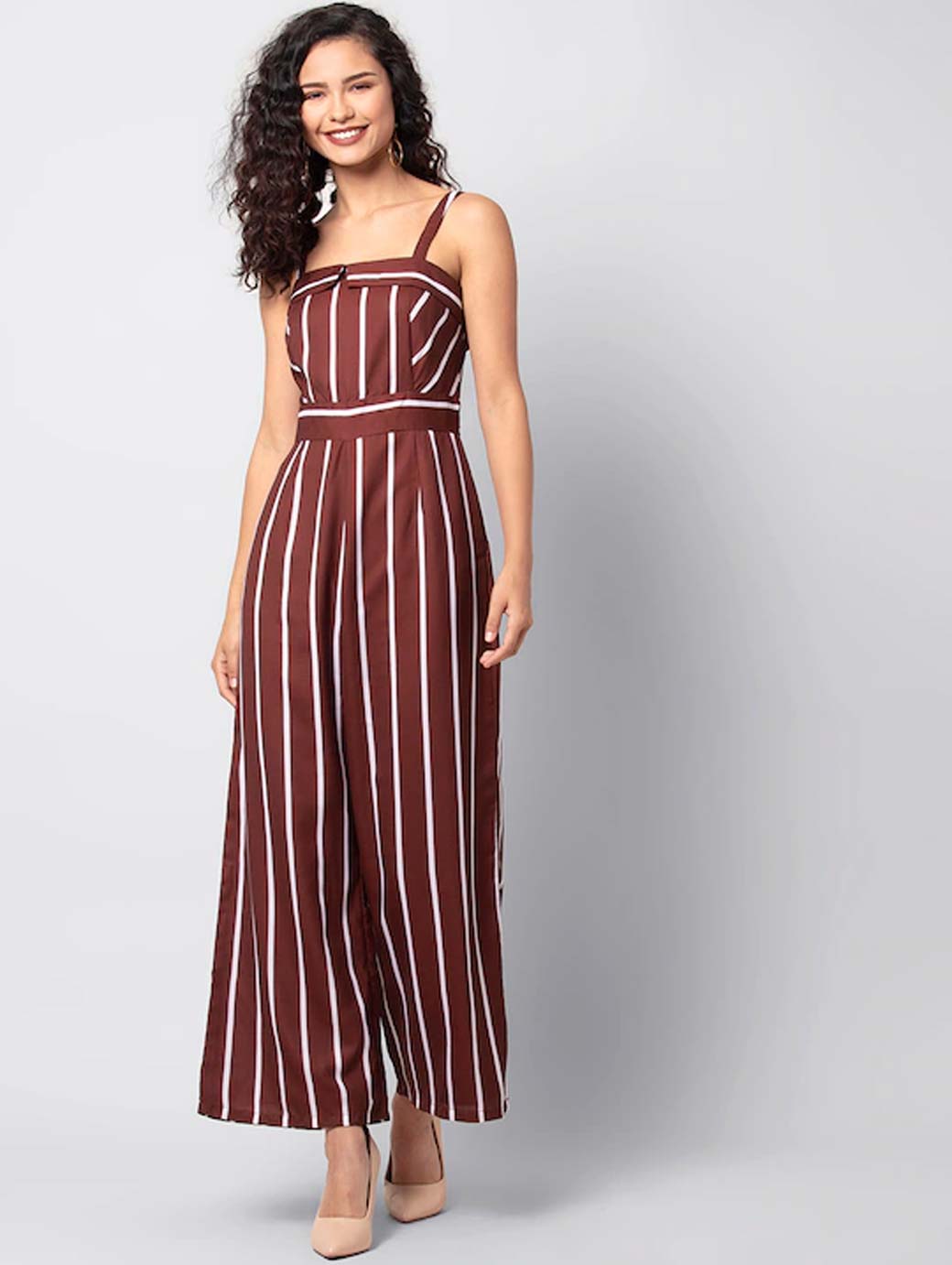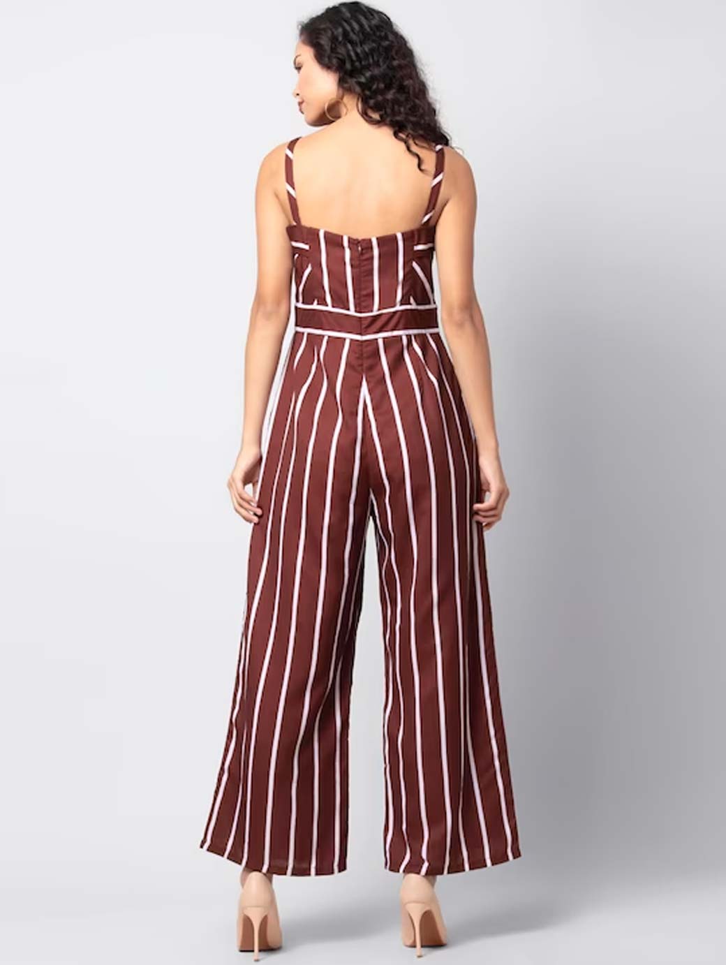 Maroon and white striped basic jumpsuit, has a shoulder straps, sleeveless