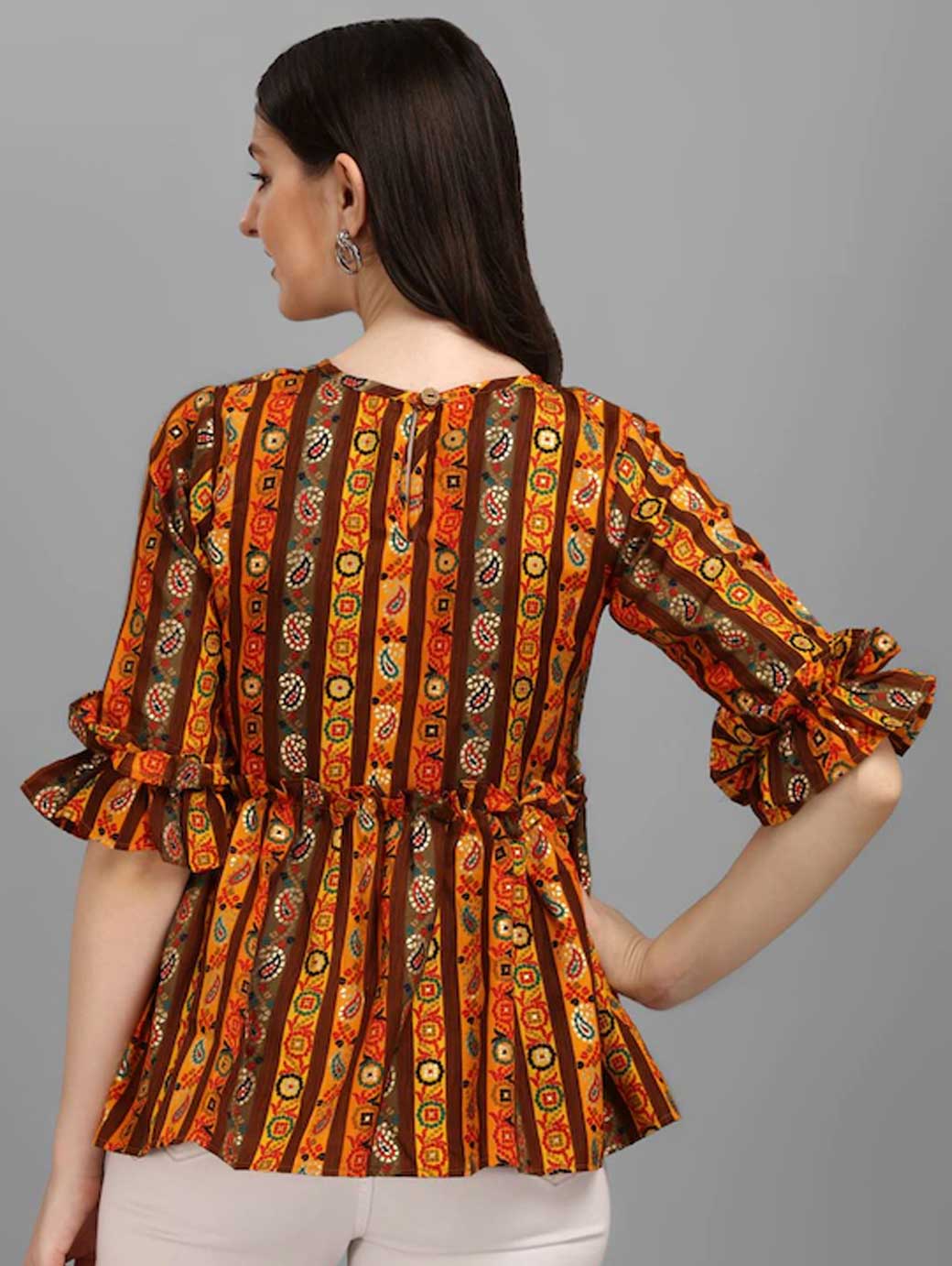 Yellow and brown regular cinched waist top, Ethnic motifs print, Boat neck, short, bell sleeve sleeves, Knitted.